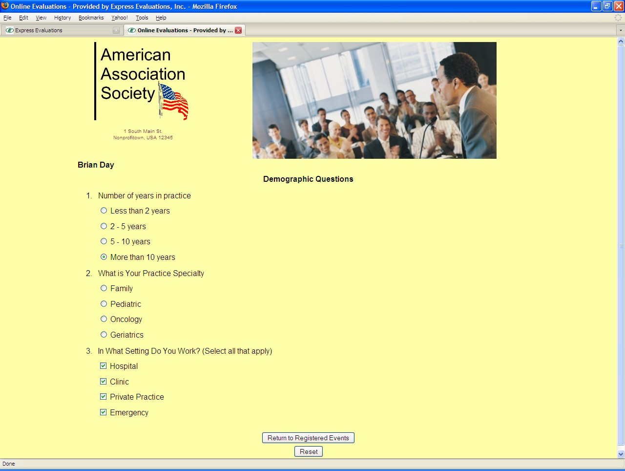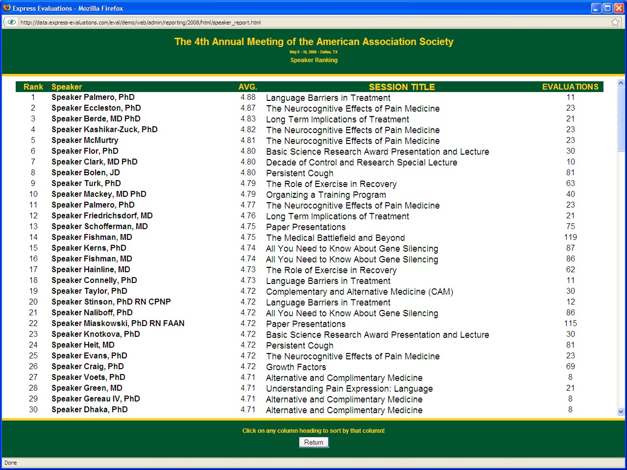 Speaker/Presenter objectives and disclosures - Speaker names and disclosures can be included with their evaluation criteria. Normally, speakers are evaluated against a standard set of objectives. This allows for a ranking of speakers amongst their peers (see Speaker Ranking Report). |